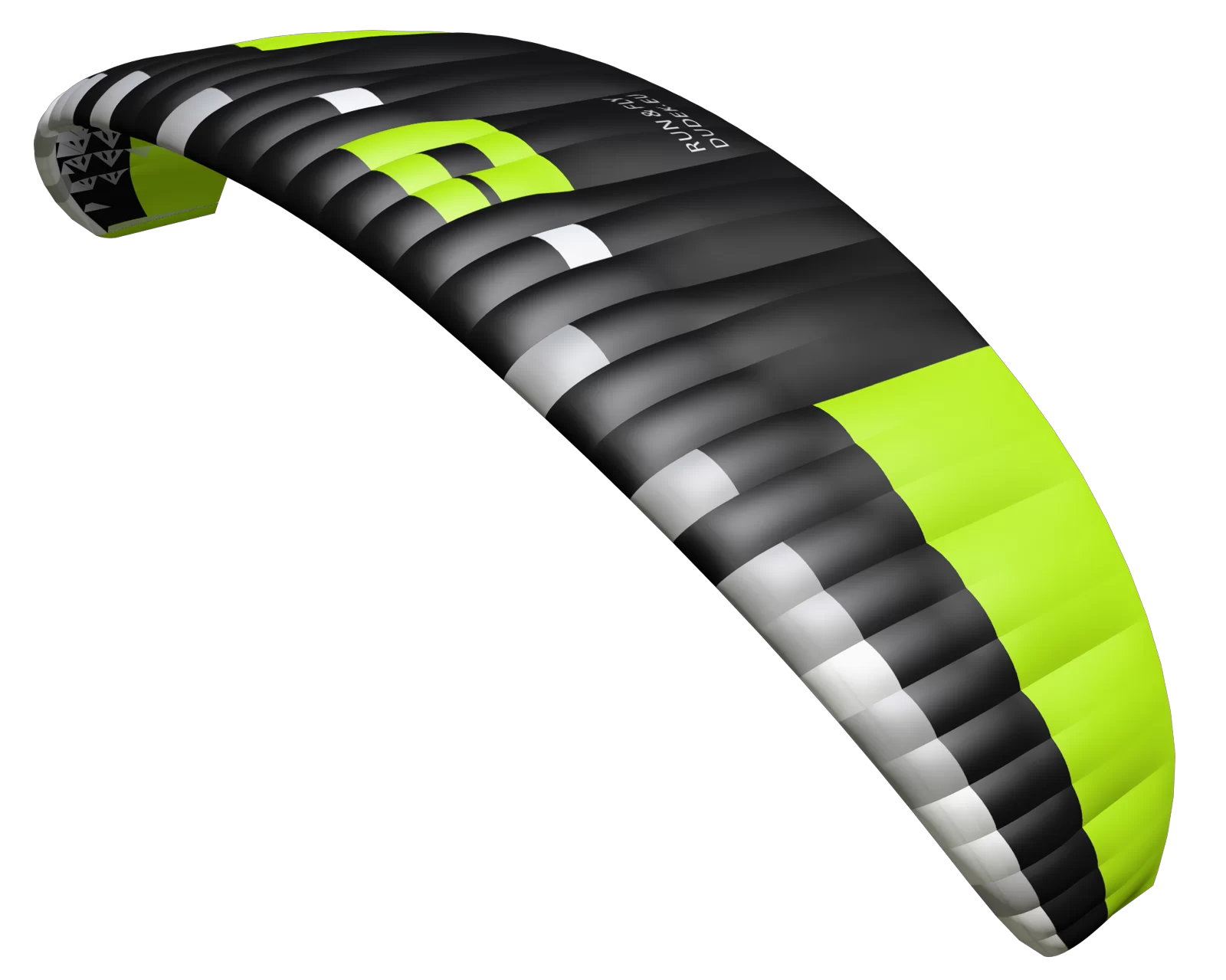 Η μπροστινή άκρη του Run & Fly 2 είναι κατασκευασμένη από διπλά εμποτισμένο ύφασμα Porcher Sport, το οποίο είναι πιο ανθεκτικό. Ομοίως, οι κύριες νευρώσεις είναι πλέον κατασκευασμένες από Hard Finish 32.